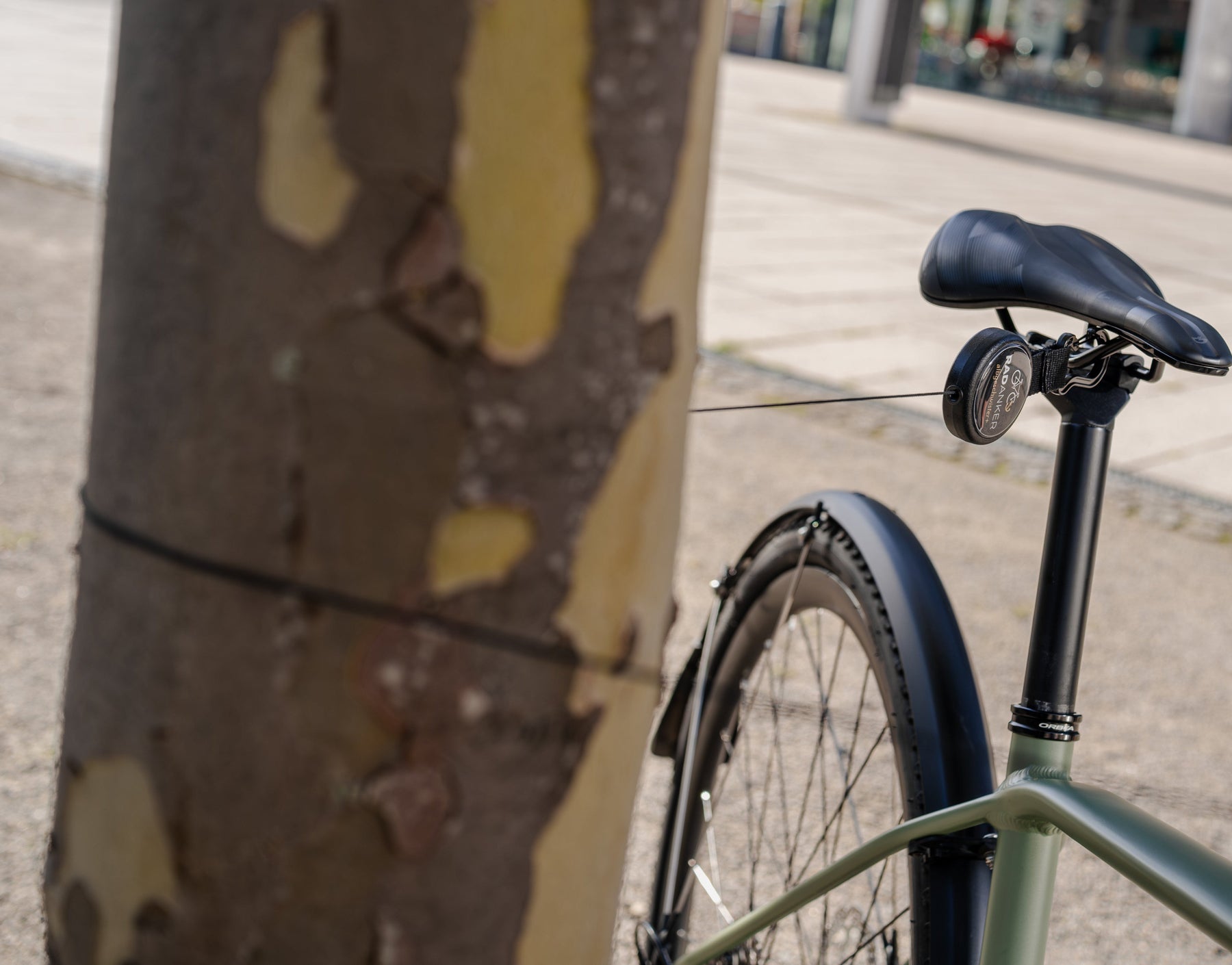 Der Radanker besitzt zwei Karabiner-Haken. Diese kannst du ganz einfach z. B. am Sattel oder am Lenker einhaken (siehe Betriebsanleitung).